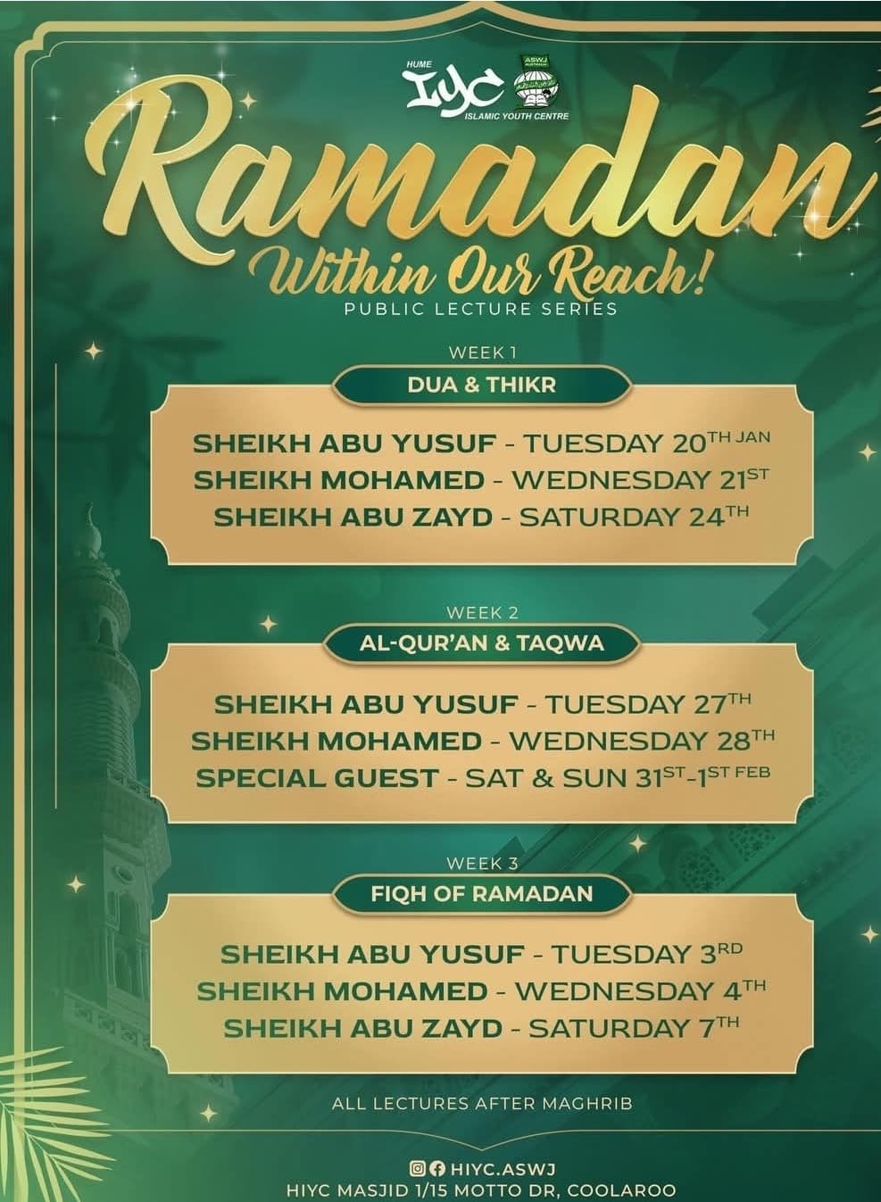 This public lecture series focuses on spiritual preparation for the month of Ramadan. It encourages attendees to hasten towards good deeds, seek Allah's forgiveness, and understand His promises and warnings. Key themes include saving oneself and one's family, the importance of internal change, and cultivating fear and hope in Allah. The series aims to provide guidance on how to maximize the benefits of Ramadan and engage in acts of worship.