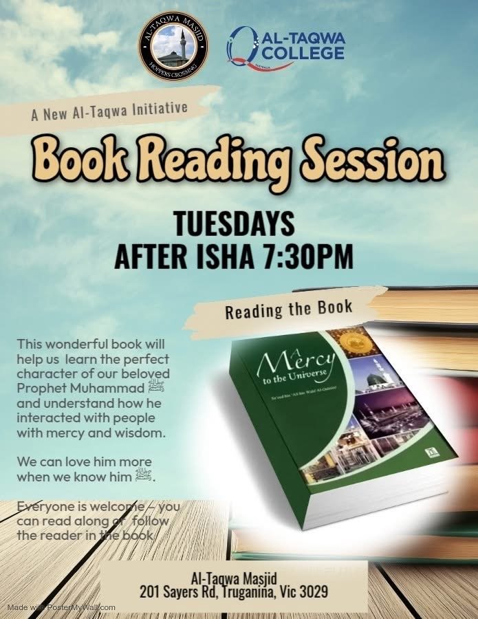 Join us in Hoppers Crossing for an enlightening Book Reading Session dedicated to exploring the profound wisdom of classic Islamic literature. This lecture-style gathering offers more than a simple reading; it is a guided journey into timeless teachings that speak to our contemporary lives. Attendees can expect a thoughtful analysis of selected passages, uncovering rich layers of meaning and practical applications for spiritual growth. The session will focus on themes of faith, resilience, and personal development, followed by an interactive Q&A to foster community discussion and shared understanding. It's an ideal opportunity to connect with our rich intellectual heritage in a welcoming, scholarly environment.